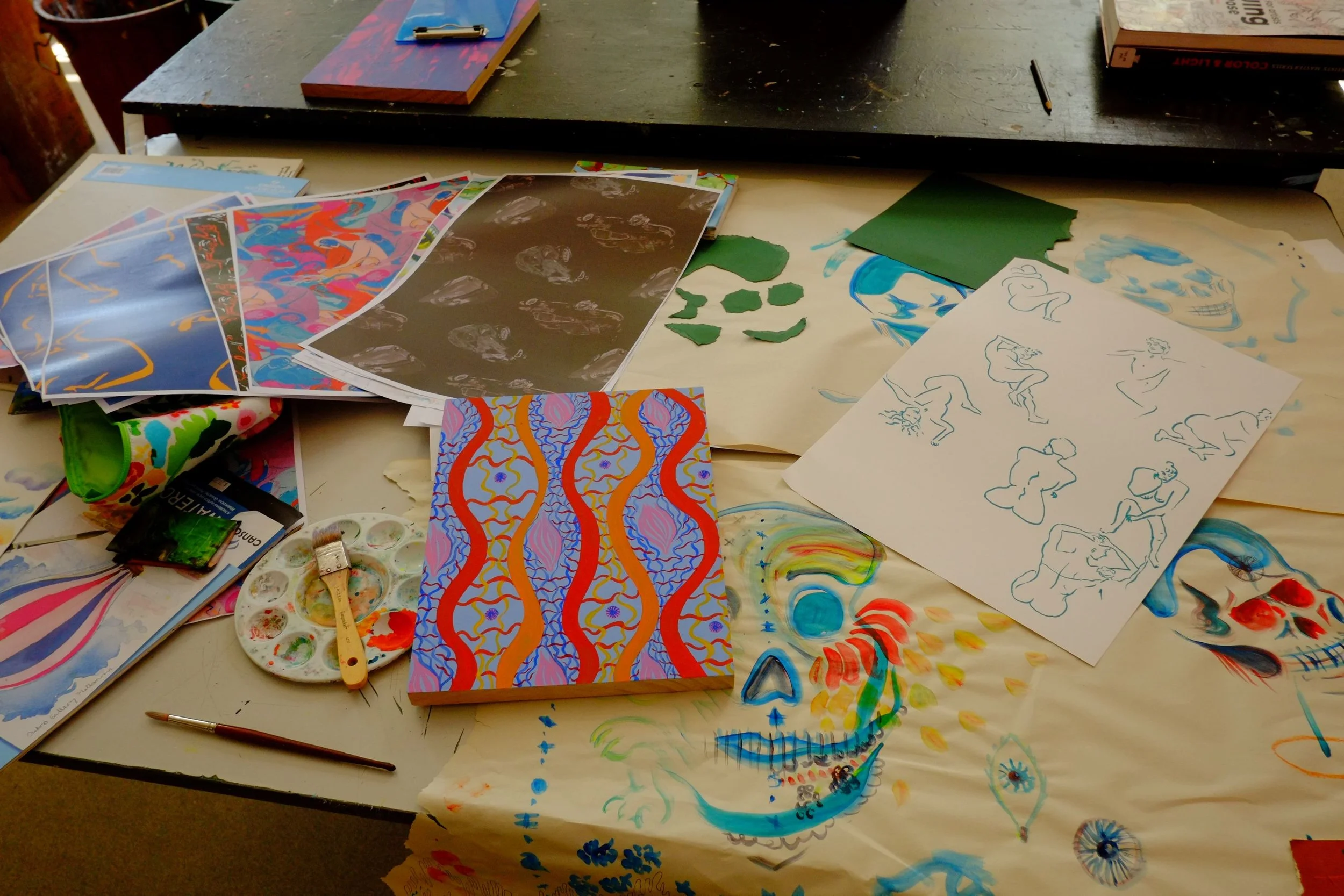 My education residency enriched my creative experience, with both tangible creative outcomes and a dynamic exchange with the students. The core of the residency focused on translating newly created and existing artwork into a commercially viable product. The main activity was crafting a series of illustrations that were then digitally constructed into captivating textile designs and printed onto fabric. The students were able to witness this transformation firsthand, from initial sketches to vibrant fabric prints. The entire process was meticulously documented, allowing me to share my artistic development with the students as the project progressed. Towards the end of the residency, I taught students how to make their own repeating patterns for printing to understand the process in its entirety.