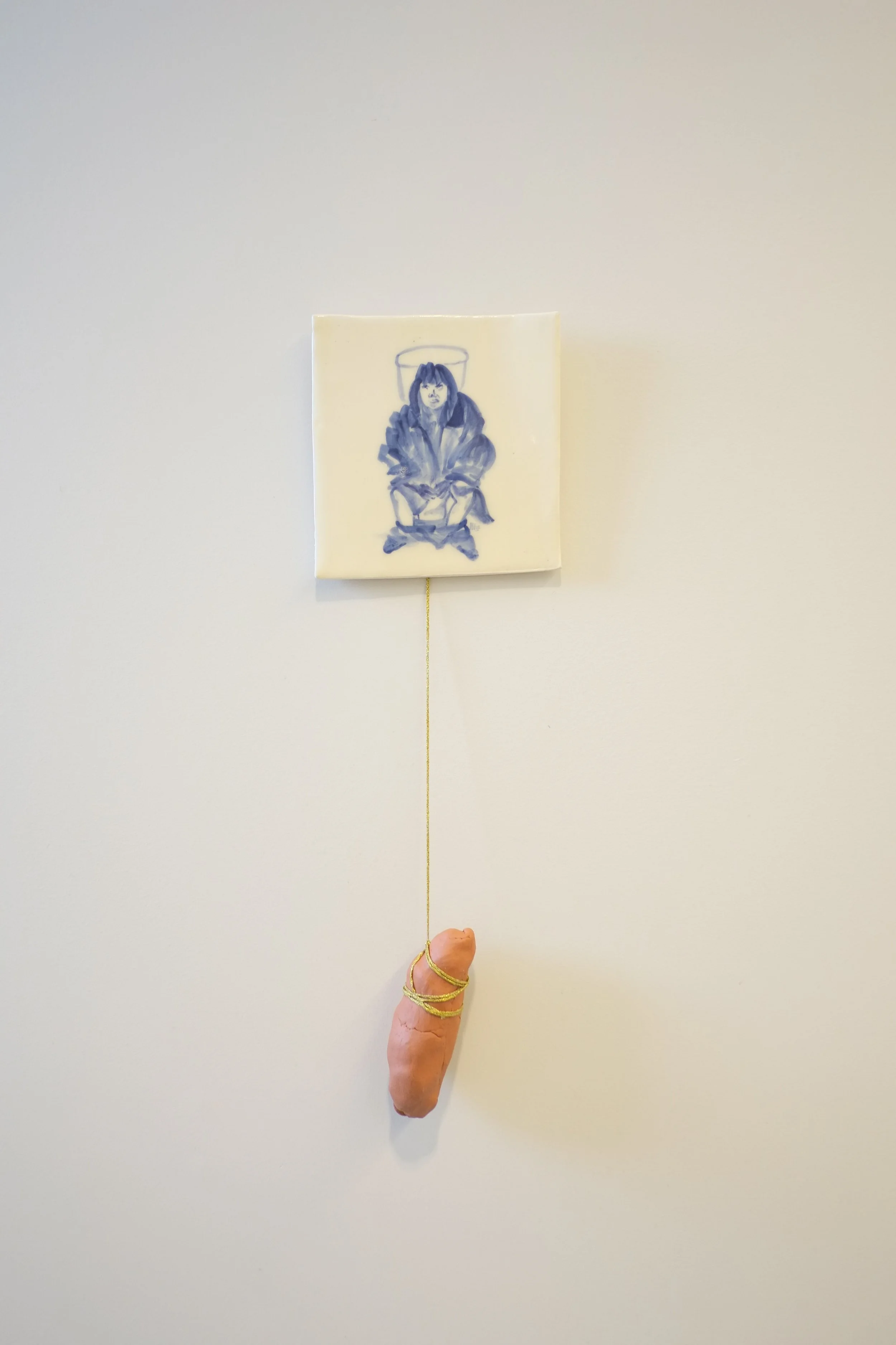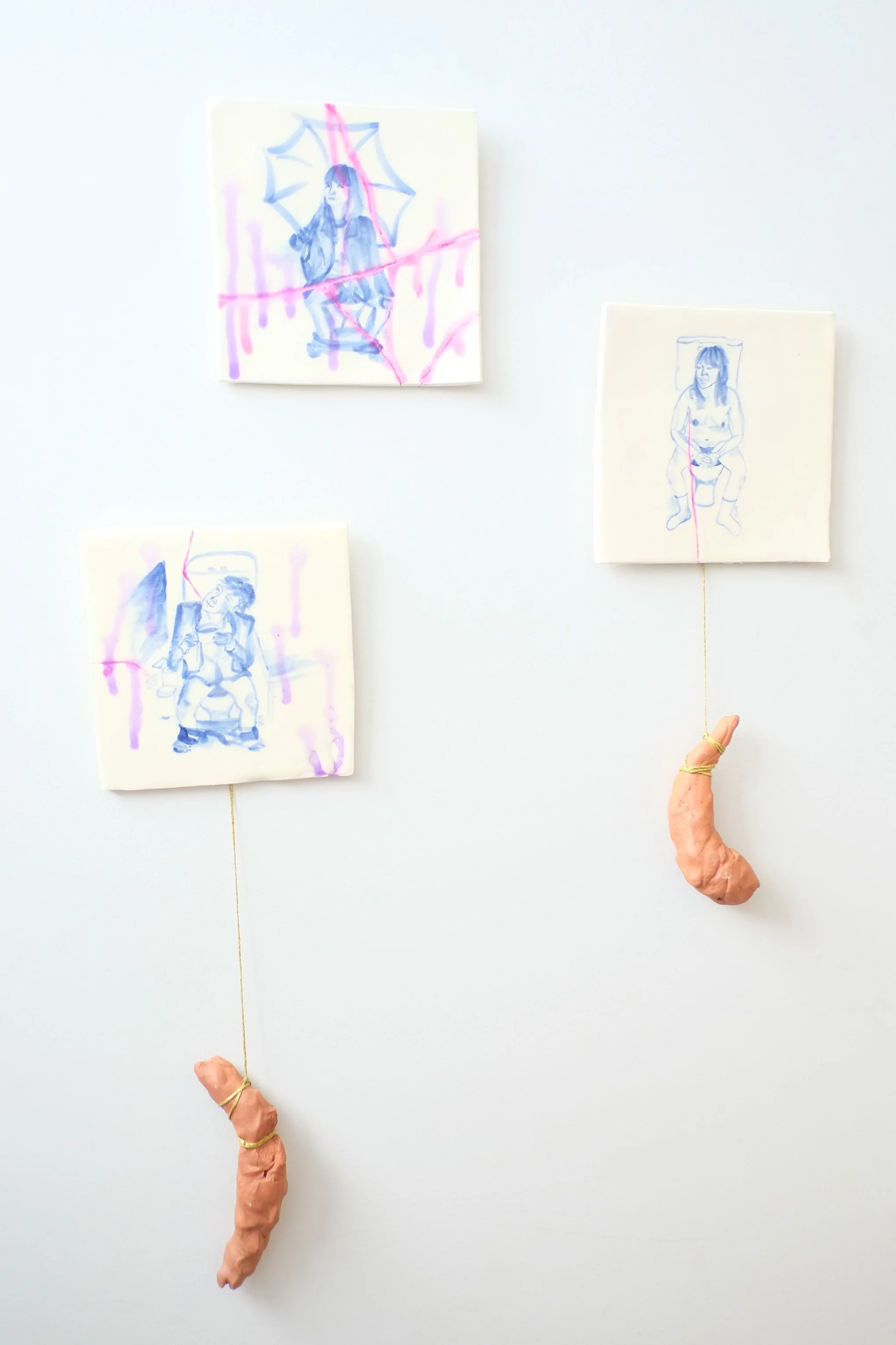 The exhibition was a series of tiles with paintings of people sitting on the toilet in a contemplative manner, hung in the bathroom at Moonah Arts Centre.